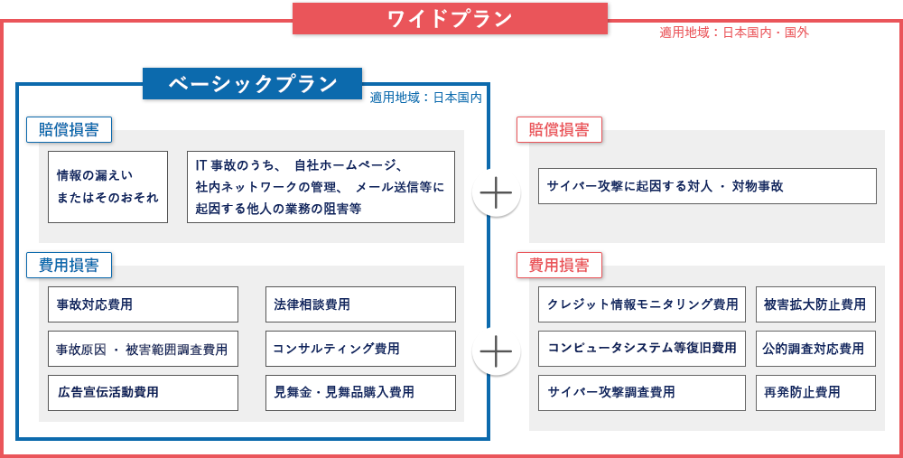 サイバーセキュリティ保険には、「ベーシック」「ワイド」の2つのプランがあります。